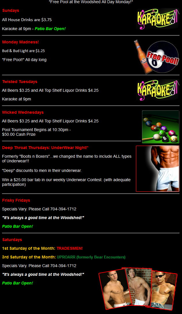 Click the image above or this link to go to The Woodshed Lounge. Below are some of their specials!
